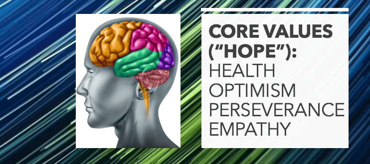 Thus, our Core Values are described by using the word “HOPE,” which is used as an acronym for Health, Optimism, Perseverance, Empathy.